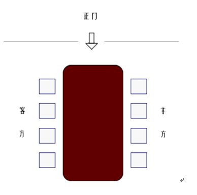 领导为偶数时,1、2号领导同时居中,2号领导依然在1号领导左手位置,3号领导依然在1号领导右手位置。 如下如所示: